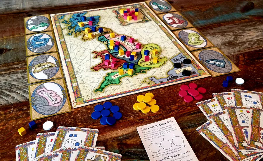 Ogni giocatore riceve un set identico di otto carte azione, che rappresentano le proprie mosse politiche. Sul tabellone, otto regioni della Britannia iniziano con cubi di influenza inglese, scozzese e gallese, pronti a contendersi il potere dopo la morte del re.