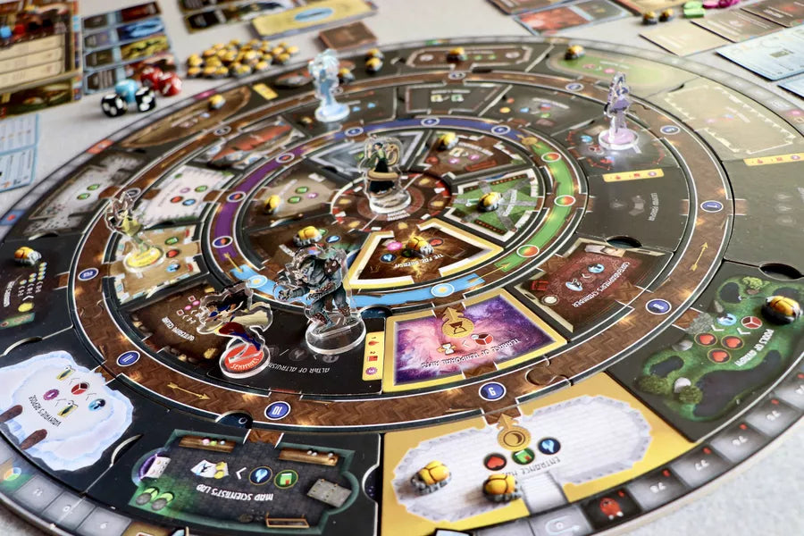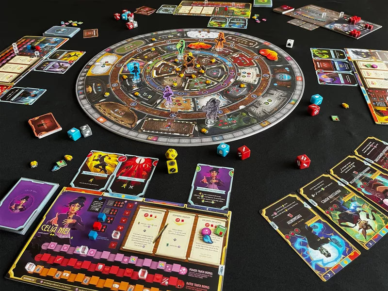 Attraverso dice drafting, gestione risorse, potenziamento del personaggio e azioni su mappa dinamica, il gruppo dovrà bilanciare strategia e collaborazione per sopravvivere. La meccanica del tempo è il cuore pulsante del gioco: ogni scelta modifica l’architettura della casa, cambiando collegamenti e percorsi.